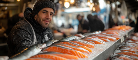 Man in winter jacket standing next to icy display of salmon fillets at outdoor fish market during cold season. Local seafood market