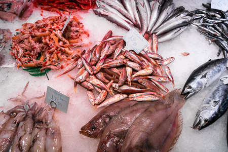 Assortment of fresh daily catch of fishes, seashells, molluscs on ice on fish market in Spain