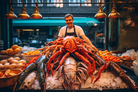 Vibrant Fish Market Bursting With Fresh Seafood Delights, A fish market filled with an array of fish and seafood, bustling with people, AI Generated