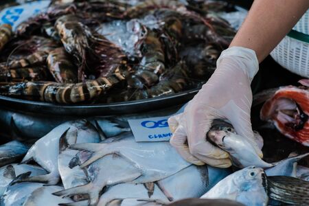 The market for marine fish. Street market. Sale of fresh fish. Freshly caught fish. Fish shop. Products for the restaurant. Fishery. Asian cuisine. Seafood. Healthy diet. Fisherman. Catch. Fresh food