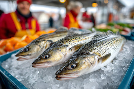 Raw pike perch fish displayed on a bed of crushed ice at an outdoor market