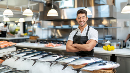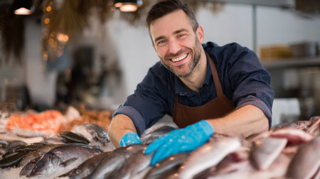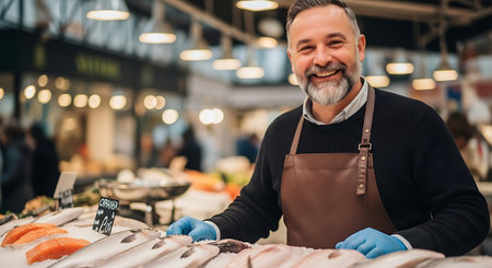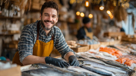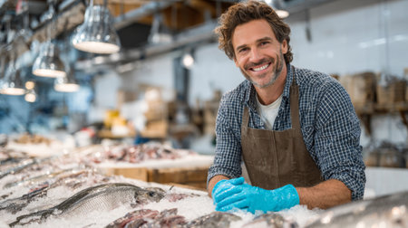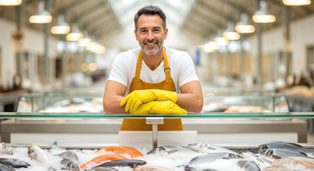 Smiling male fishmonger in yellow gloves and apron, stands behind a seafood display in a bright fish shop, highlighting fresh fish and inviting atmosphere