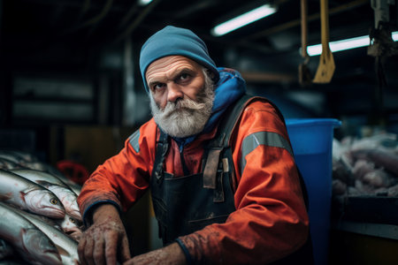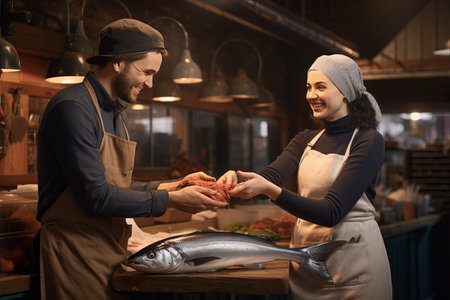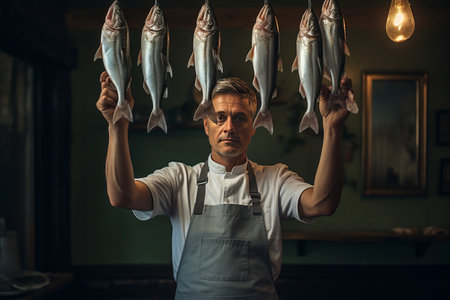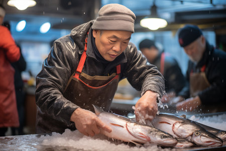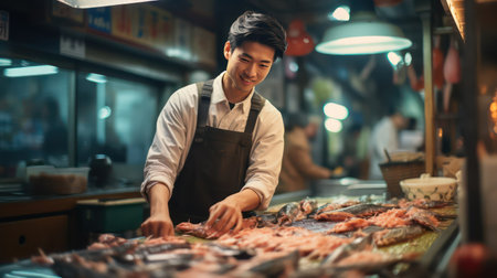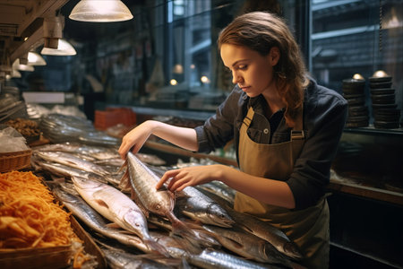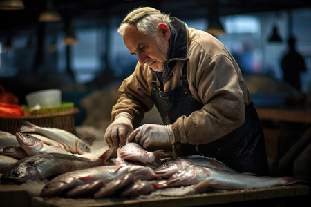 A skilled chef wearing an apron is seen meticulously working on some fish in order to create a delicious and flavorful seafood dish, fishmonger picking fish in fish market, AI Generated
