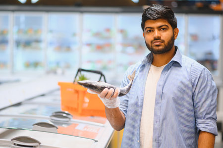 Young Indian man wearing gloves selecting fresh fish from refrigerated display in grocery store
