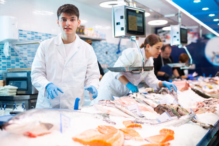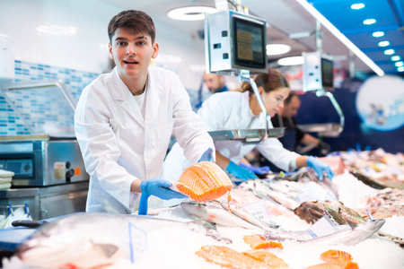 Young seller in fish department of a supermarket lays out raw fresh fish on counter