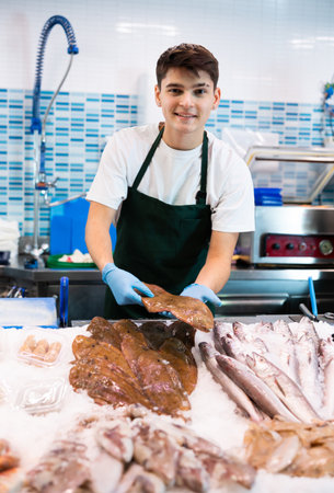 Fresh and Responsive: A Young Shop Assistant Expertly Handling Cod Fish in a Vibrant Fish Store
