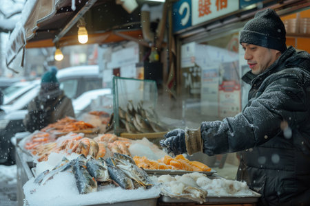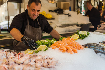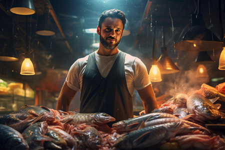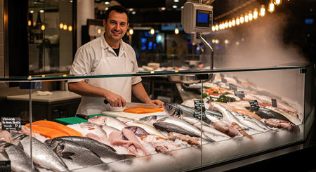 Fish shop display highlights a male fishmonger preparing fresh seafood, surrounded by an array of fish and shellfish, creating a lively market atmosphere