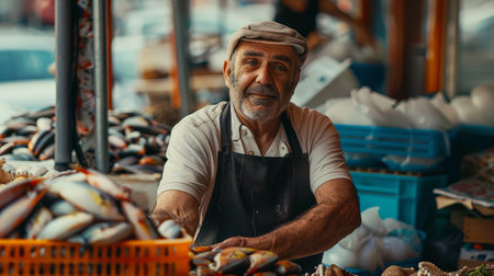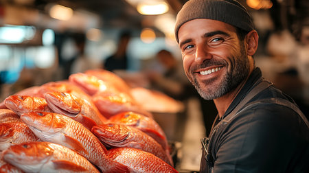 Portrait of a smiling fresh fish vendor with soft lighting and joyful expression, emotions concept, banner