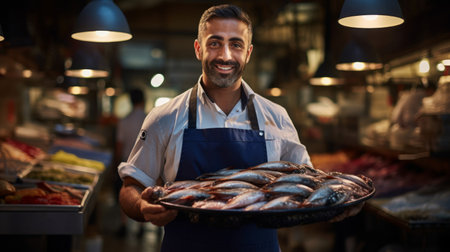 Arabian fish seller market. Eastern fisherman trading seafood on bazaar. Generate ai