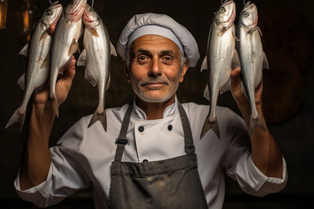 Master Chef Showcasing Freshly Caught Mackerel on Hooks
