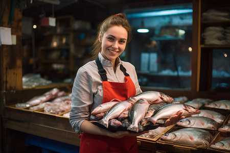 Friendly and Efficient Shop Assistant Showcasing Fresh Cod Fish in a Responsive Fish Store Environment – AR 3:2