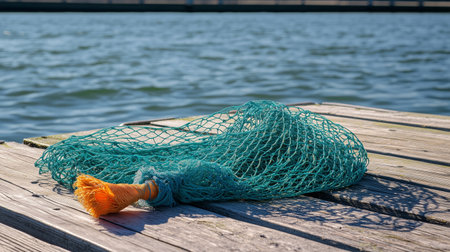 Fishing net draped on wooden dock glimmers under soft sunlight near waters edge at golden hour