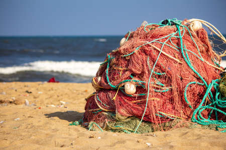 View of fishing nets used by fishermen ready for use, Kovalam Beach, Chennai