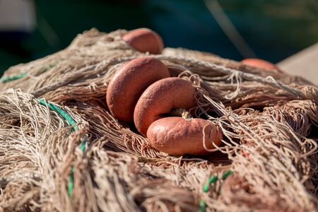 Fishing net with round floats in black and white. The network is old and lying on the ground.