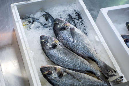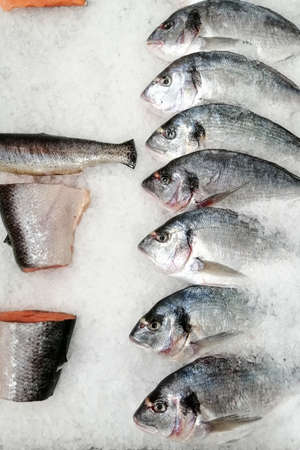 Raw fresh on mediterranean market counter. raw fresh sea bream fish on ice in market store. Dorado fish background. Health food concept