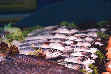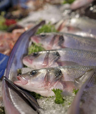 Fresh fish on ice in the supermarket. Shallow depth of field.