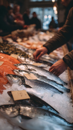 A fresh fish on ice at seafood market with hands selecting salmon and whole trout, busy stall atmosphere with labels and cold display
