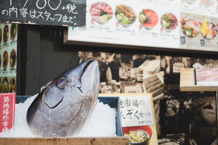 Tsukiji fish market - November 2017, Tokyo, Japan : fresh raw fish and many sea food in Tsukiji market most of travel target in Tokyo, Japan