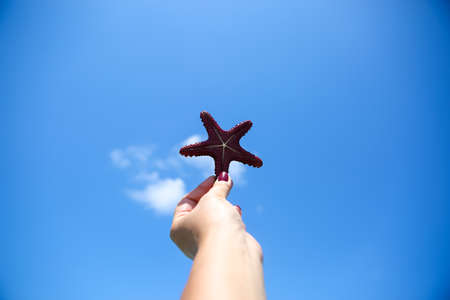 Starfish in hand and Bright colors of the nature, morning on Pantai Cenang beach, Langkawi island, Malaysia