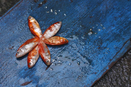 Couple of five-pointed starfish in the ocean on a blue background. The effect of bokeh close up. Life in the ocean. A pair of starfish, a concept of romance and tourism. Free space for text.
