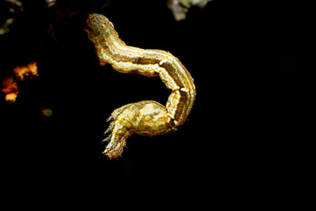 Detailed view of Traminda aventiaria larvae on dark background. Capturing the unique texture of its exoskeleton. Wulai, New Taipei City.