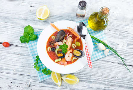 French bouillabaisse soup on wooden table. Top view Copy space