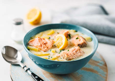 Creamy fish soup with salmon, potatoes, onions , carrots, dill and celery . Kalakeitto- traditional dish of the Finnish cuisine or Russian Ukha Fish Head Soup. Healthy Food Concept. Omega -3