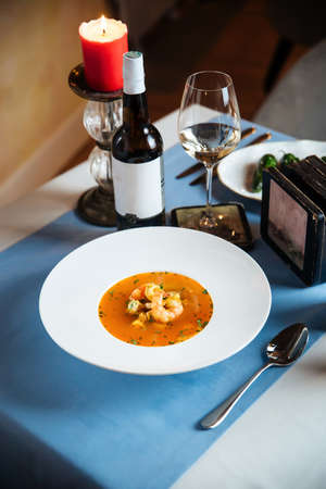 Gourmet spanish seafood soup on the served table with a bottle of wine