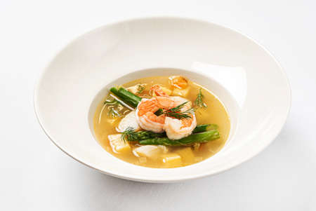 French fish soup Bouillabaisse with seafood, salmon fillet, shrimp, rich flavor, delicious dinner in a white beautiful plate. Close up. Copy spase