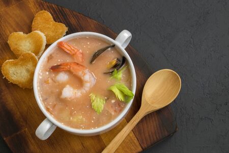 Seafood fish soup with mussel and shrimps and piece of grilled bread on black background top view