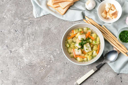 Fish soup is a traditional dish for coastal residents. Home cooking or culinary background abstract. Homemade dish.