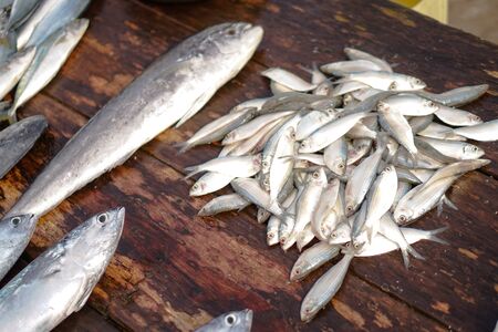 Fish market in Asia. Catching sea and ocean animals in the Indian Ocean. Tuna on shelves for sale. Exotic background