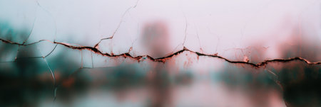 A cracked surface reveals a blurred cityscape in soft, merging colors, evoking a dreamlike, abstract quality.