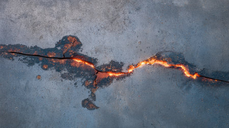 This scene showcases a concrete surface with a prominent crack, exposing a fiery orange glow beneath, highlighting the contrast in textures and colors.