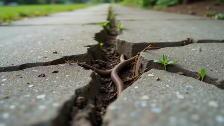 Cracks reveal nature’s resilience on a sidewalk in the early morning light