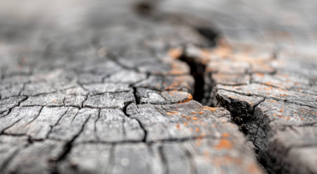 A close up of a wooden surface featuring a prominent crack. The image highlights the texture and natural patterns in the wood grain.