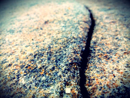 Extreme low-angle photograph focusing sharply on a significant vertical crack running through a flat, gray, coarse-grained rock surface, possibly granite, where a small amount of water is visible pooled at the bottom of the fissure; the background shows a soft focus expanse of similar rocky terrain with some sparse, muted vegetation and hints of white or snow.