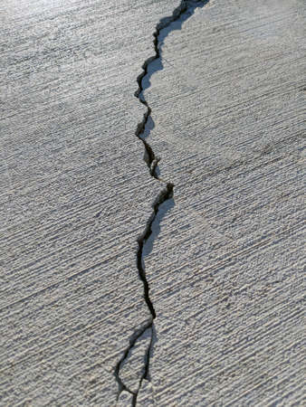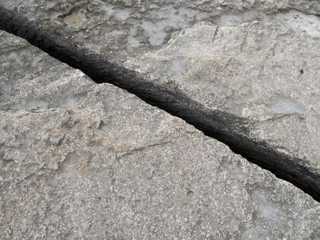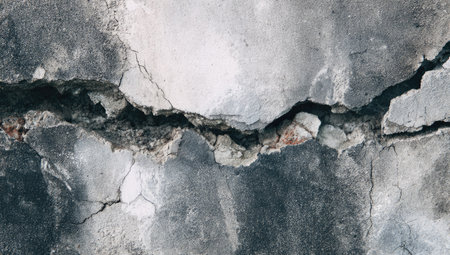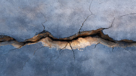 This image presents a close-up view of a cracked concrete surface. The rough texture reveals gray tones with areas of light and shadow, indicating a textured and weathered appearance. The composition emphasizes the cracks, suggesting age and deterioration. This visual is suitable for use in various commercial and design projects.