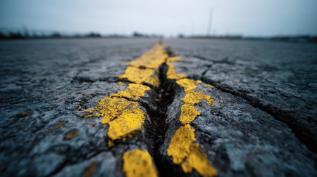 This image showcases a close-up view of a cracked asphalt road with a vibrant yellow line, highlighting urban decay under a gloomy sky, evoking feelings of abandonment.