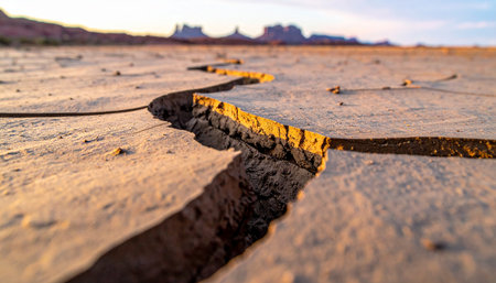 Cracked ground reveals harsh conditions, emphasizing droughts impact on the environment in late afternoon light.