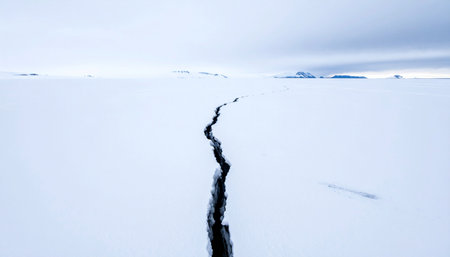 A deep, dark fissure splits a vast, frozen plain under a stark, overcast sky.