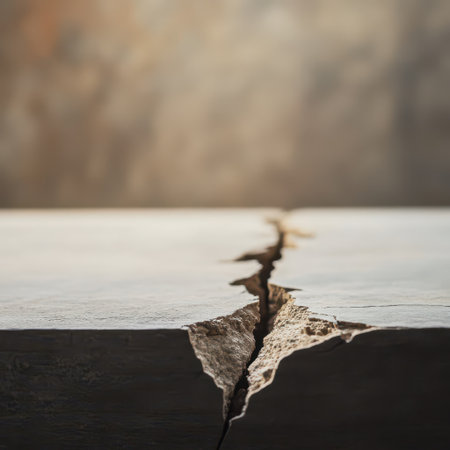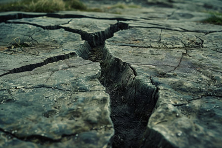 Deep fractures in concrete tell a story of wear and natural forces acting over time.