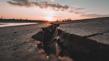 Extreme view focused on a wide, deep crack running through dry, parched ground, likely the result of severe drought or water depletion, set against a backdrop of a soft, warm sunset over a distant body of water and low horizon.