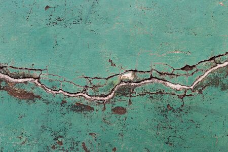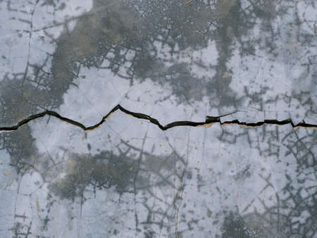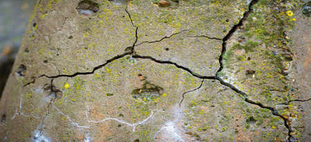 Shallow depth of field. Photo is blurred. Cracked concrete. Cracks in concrete are caused by internal tensile stresses caused by external forces, volume changes and creep.