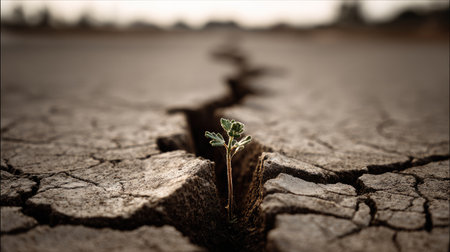 A small plant emerges from the crevice of cracked, dry earth. The image depicts a close-up view with shallow depth of field, emphasizing texture and detail. The color palette is dominated by earth tones. The scene evokes themes of resilience and growth in challenging conditions, suitable for various editorial and commercial purposes.