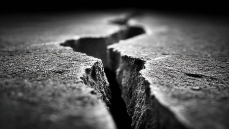 A deep, jagged fissure splits a cracked concrete surface, exposing rebar and rubble within its dark depths.