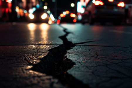 A close-up view of a cracked road surface illustrating the impact of natural disaster, with faded vehicles and a blurred forest backdrop, symbolizing environmental changes.