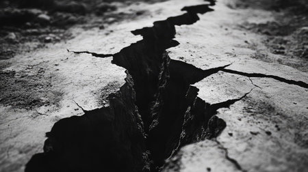 A dramatic close-up view of a deep geological fissure splitting the earth's surface. The dark, textured ground is fractured, revealing a deep chasm. White crystalline formations line the edges of the crack, creating a stark contrast. The lighting emphasizes the depth and ruggedness of the terrain, suggesting a powerful natural event. The overall impression is one of raw, untamed earth.
