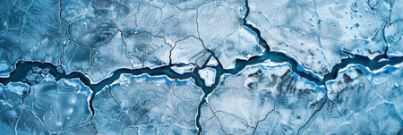 The frozen river's cracked ice patterns are mesmerizing from the air, photography emphasizes the cool blues and whites, banner