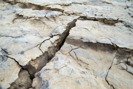 Uneven, desiccated soil crust with wide cracks and a dry matte finish in a barren setting
